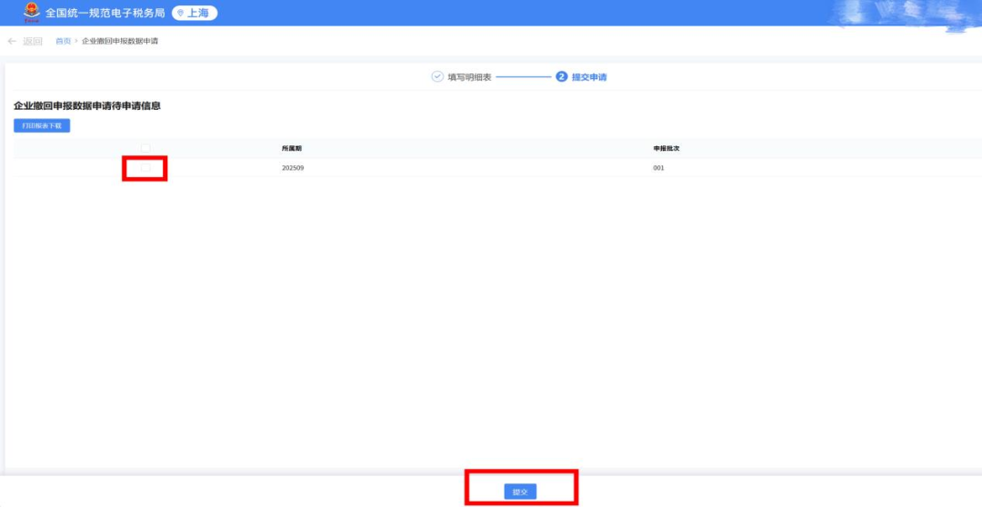 勾选刚刚填写好的撤回申请数据,点击 “提交” 按钮。