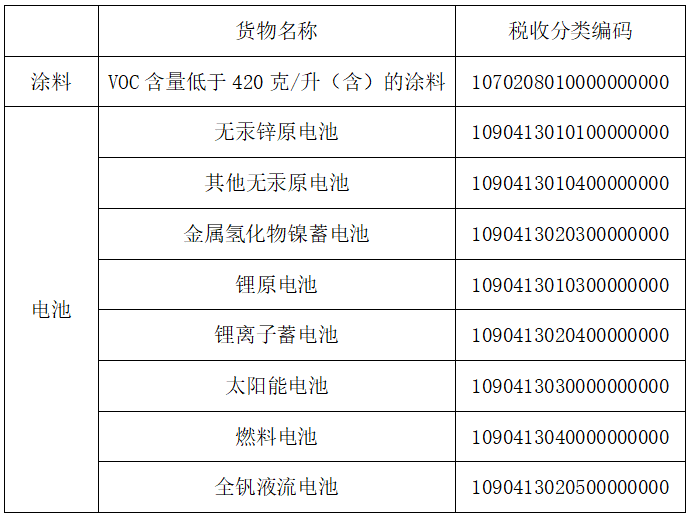 无汞原电池、金属氢化物镍蓄电池(又称“氢镍蓄电池”或“镍氢蓄电池”)、锂原电池、锂离子蓄电池、太阳能电池、燃料电池和全钒液流电池免征消费税。