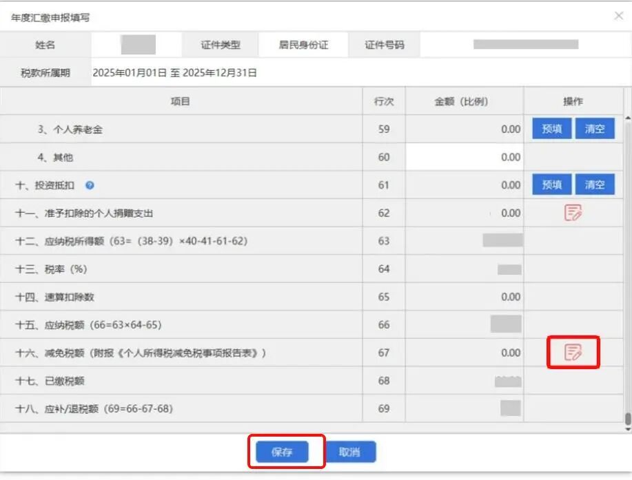 3、身份填报:双击【姓名栏】,填写年度汇缴申报表相关内容,确认无误后点击【保存】。