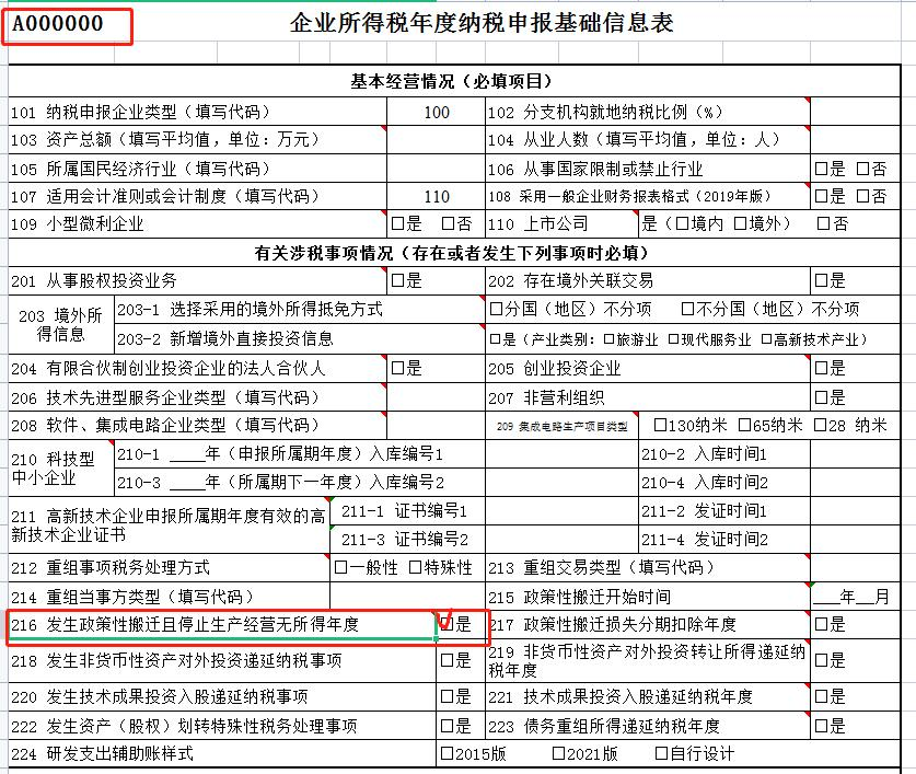纳税人发生政策性搬迁事项,从搬迁年度次年起,至搬迁完成年度前一年度止,可作为停止生产经营活动年度,从法定亏损结转弥补年限中减除。《企业所得税年度纳税申报基础信息表》(A000000)中的“216发生政策性搬迁且停止生产经营无所得年度”应为“是”。